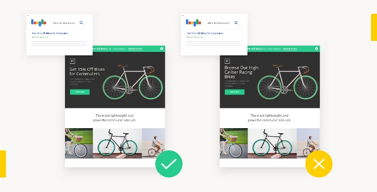 Most visitors will leave your site within a few seconds of arrival if you don’t reinforce their mission, so it’s crucial that the buyer’s journey flows smoothly from ad to page. By ensuring a strong message match, you’re letting them know that they’ve made a “good click” and helping them along.